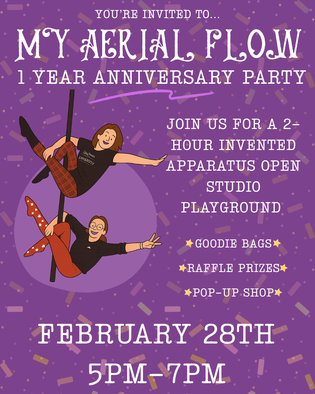 Come celebrate our 1‑Year Anniversary in the air! Step into a 2‑hour aerial playground filled with energy, community, and celebration. Enjoy goodie bags, raffle prizes, and a pop‑up shop stocked with treats and treasures.